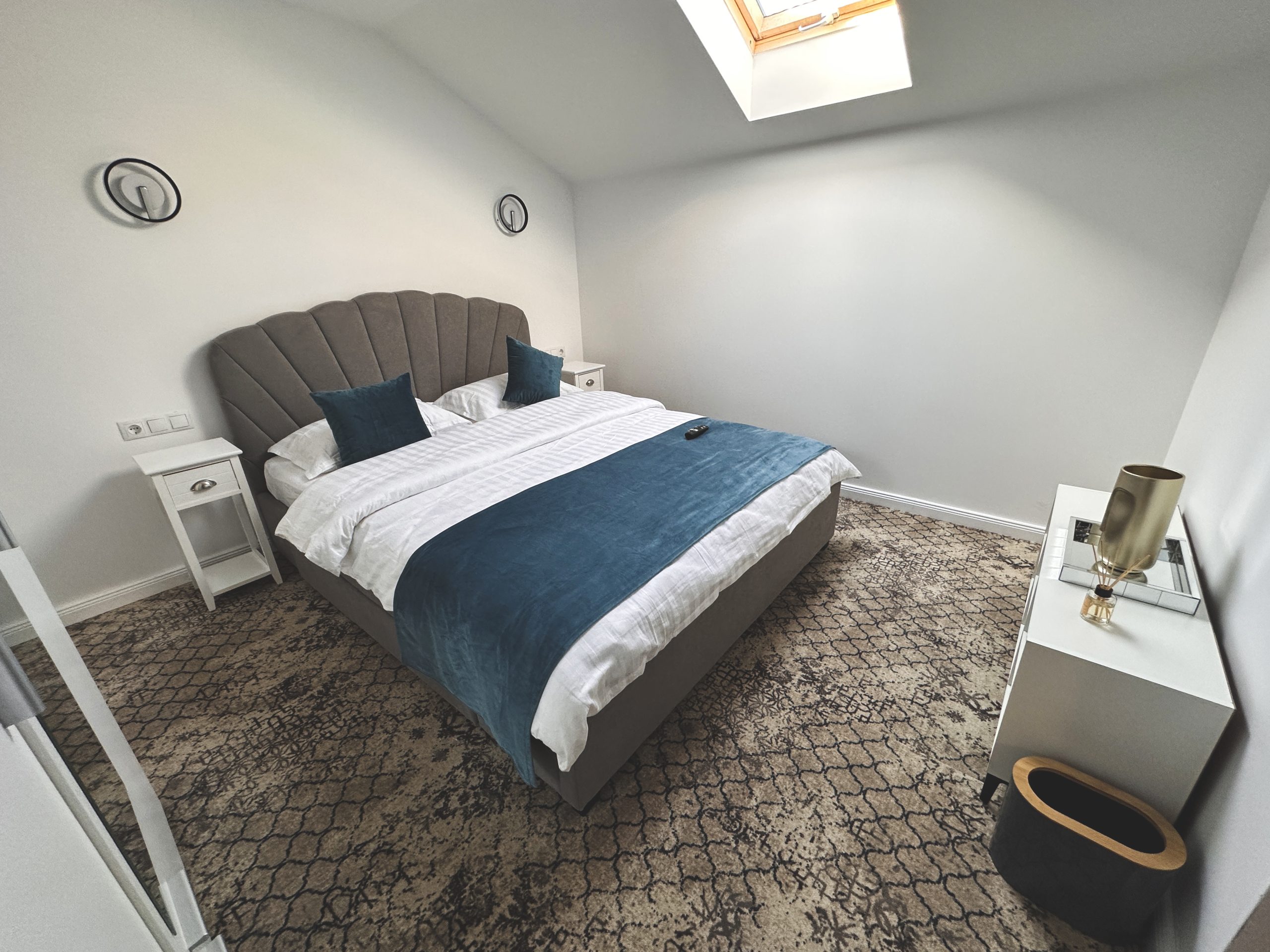 În acest apartament impresionant vă veți simți, cu siguranță, speciali! Este ideal pentru o ședere alături de familie și 1-2 copii. Amenajate în stil modern, dar și elegant, apartamentele noastre vă oferă o atmosferă de lux și confort sporit. Spațiul generos, împărțit în două camere distincte, îl transformă de departe în cea mai bună alegere când vine vorba de a petrece timp cu familia. Apartamentul beneficiază și de un balcon exterior. Dotările acestui apartament sunt: Pat King Size (180x200cm), TV SMART FULL HD/4K cu televiziune prin cablu HD și peste 90 de canale TV, funcția Smart cu aplicații (Netflix, Amazon Prime, Disney plus, etc.), wifi, minibar, birou mare, încălzire proprie și aer condiționat, canapea extensibilă, noptiere, măsuță de cafea, șifonier și baie proprie.