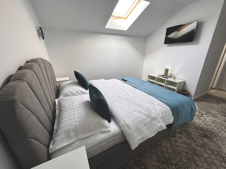 În aceste apartamente impresionante cu siguranță vă veți simți speciali! Este ideal pentru timpul petrecut alături de familie și 1-2 copii. Amenajate în stil modern, dar și elegant în același timp, apartamentele noastre vă oferă o atmosferă de lux și confort sporit. Spațiul generos, împărțit în două camere distincte, îl transformă de departe în cea mai bună alegere când vine vorba de călătorii cu familia. Apartamentul beneficiază și de un balcon exterior. Dotările acestui apartament sunt: TV SMART FULL HD/4K cu televiziune prin cablu HD și peste 90 de canale TV, funcția Smart cu aplicații (Netflix, Amazon Prime, Disney plus, etc.), wifi, minibar, birou mare, încălzire proprie și aer condiționat, canapea extensibilă, noptiere, măsuță de cafea, șifonier și baie proprie.
